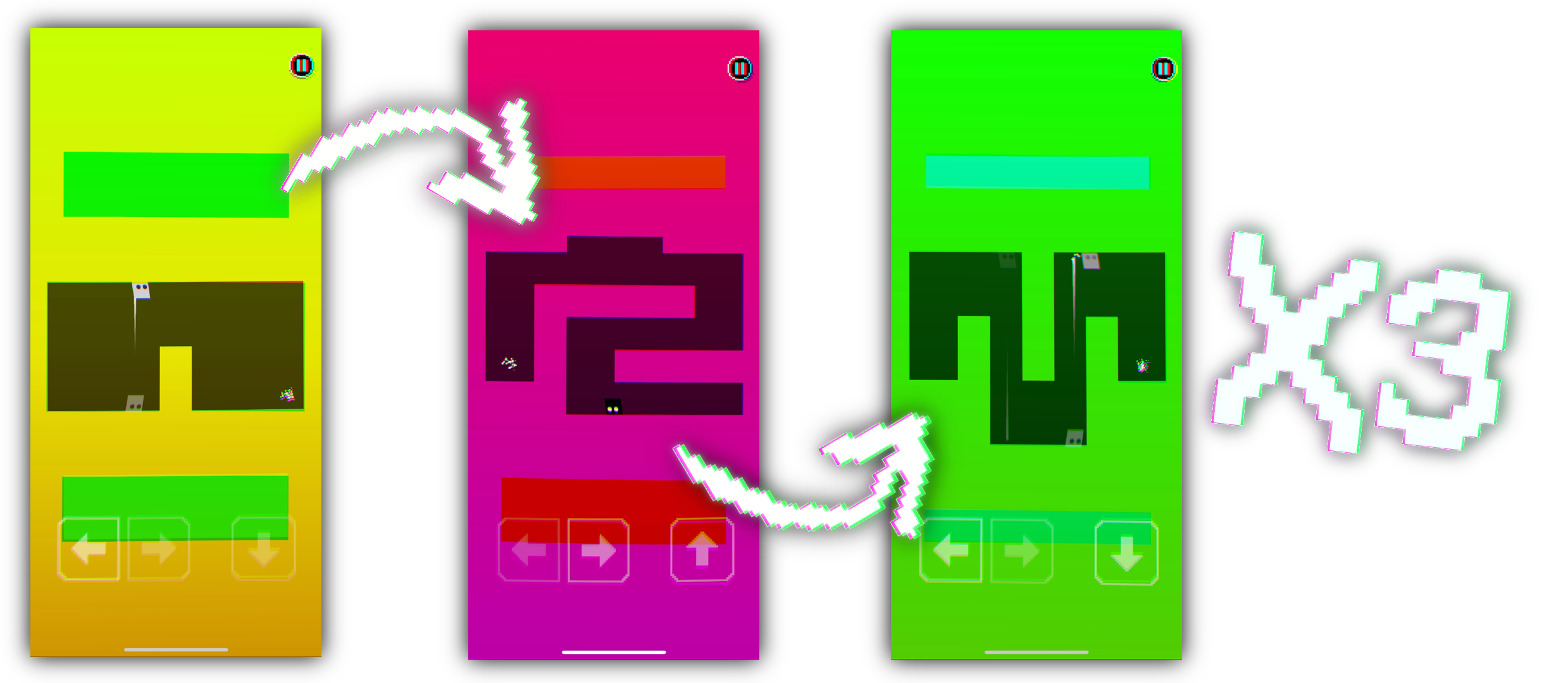 Each level consists of three different panels, where once you complete one you go to the next, and when you complete the third one, you repeat the same process two more time, but the level changed depending on how you previously played it. (3 panels, and 3 switches).